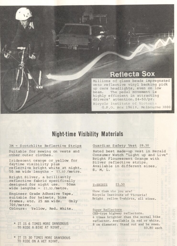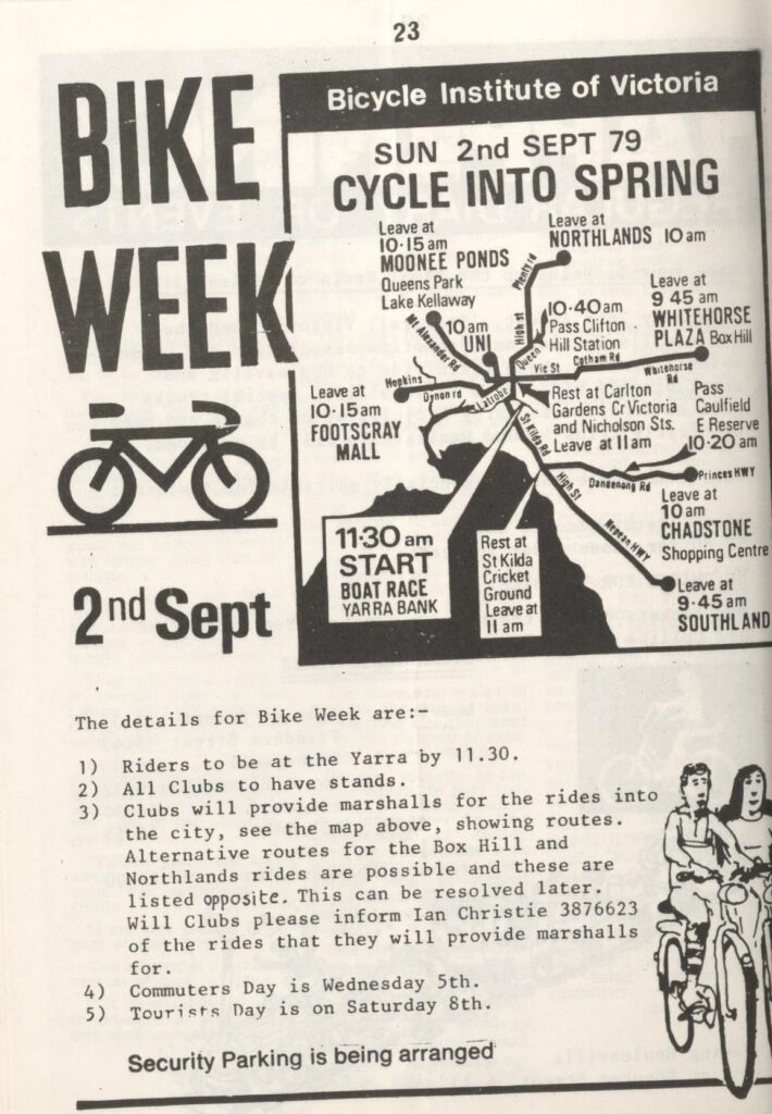 This was a time when “no separate bike paths are planned to run parallel with the new freeways” and “a high priority must be given to saving what remains of Melbourne’s creeks and river valleys…for transportation such as walking and bicycling”. There was much campaigning to be done by the fledgling BIV and the membership had to be grown and kept informed.