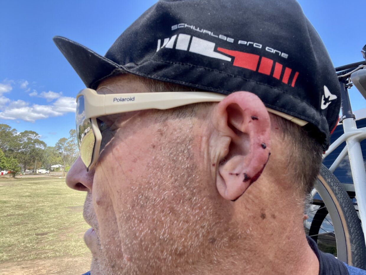 The author’s left ear after being atacked by several maggies on the Brisbane Valley Rail Trail.