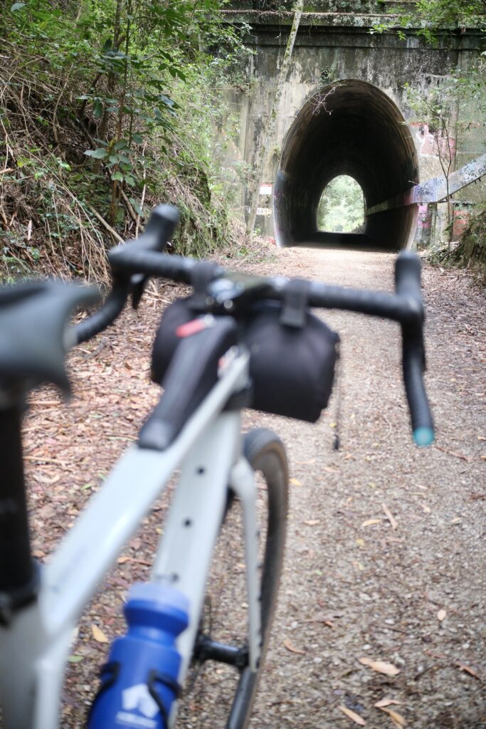 Leaving the bike shop, we rolled on, passing through another tunnel and engaging in some friendly gravel-bike competition. But all good things come to an end, and we came to an abrupt halt in a shady gully past the remnants of Crabbes Creek Station.