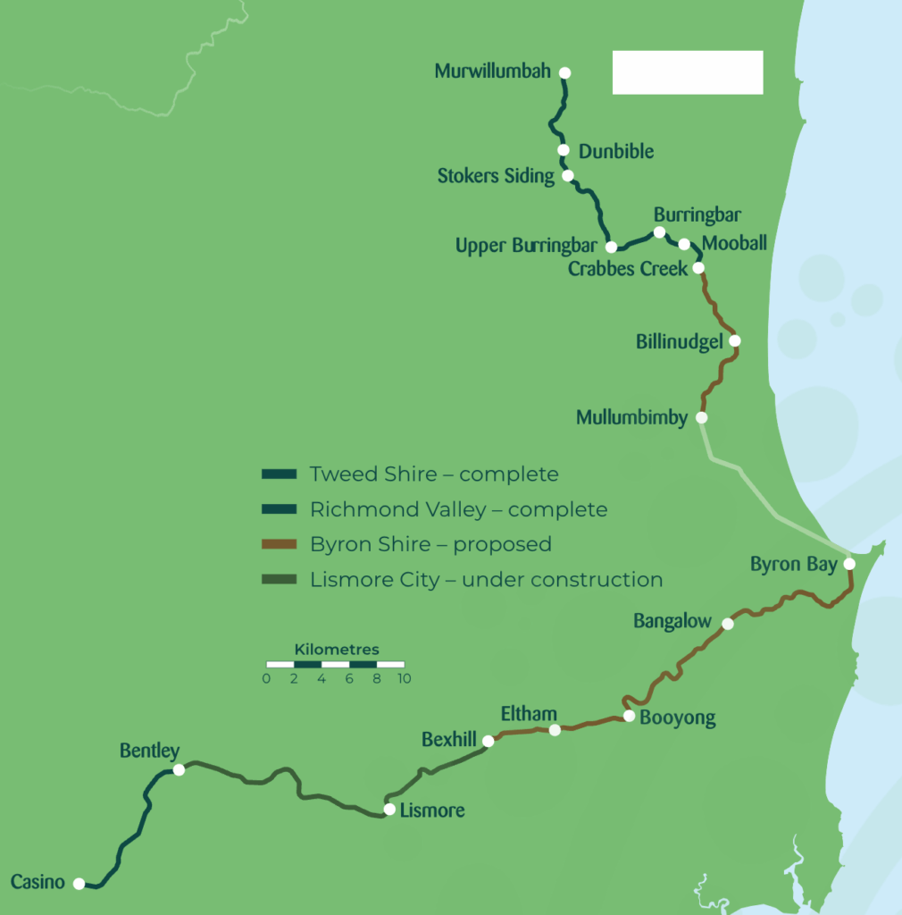 Tweed Shire Council was the first to open its section, Murwillumbah to Crabbes Creek (24 km), in March 2023. Richmond Valley Council followed in March 2024, opening the Casino to Bentley section (13.4 km). A major milestone was reached in December 2024, when Lismore City Council opened the Lismore to Bentley Bridge section (16.3 km), connecting to the existing Bentley to Casino section. This now provides a continuous 29.7 km journey from Casino to Lismore. Lismore City Council is actively working to secure funding for the next stage, Lismore to Booyong (20.9 km), which will extend the trail further north.